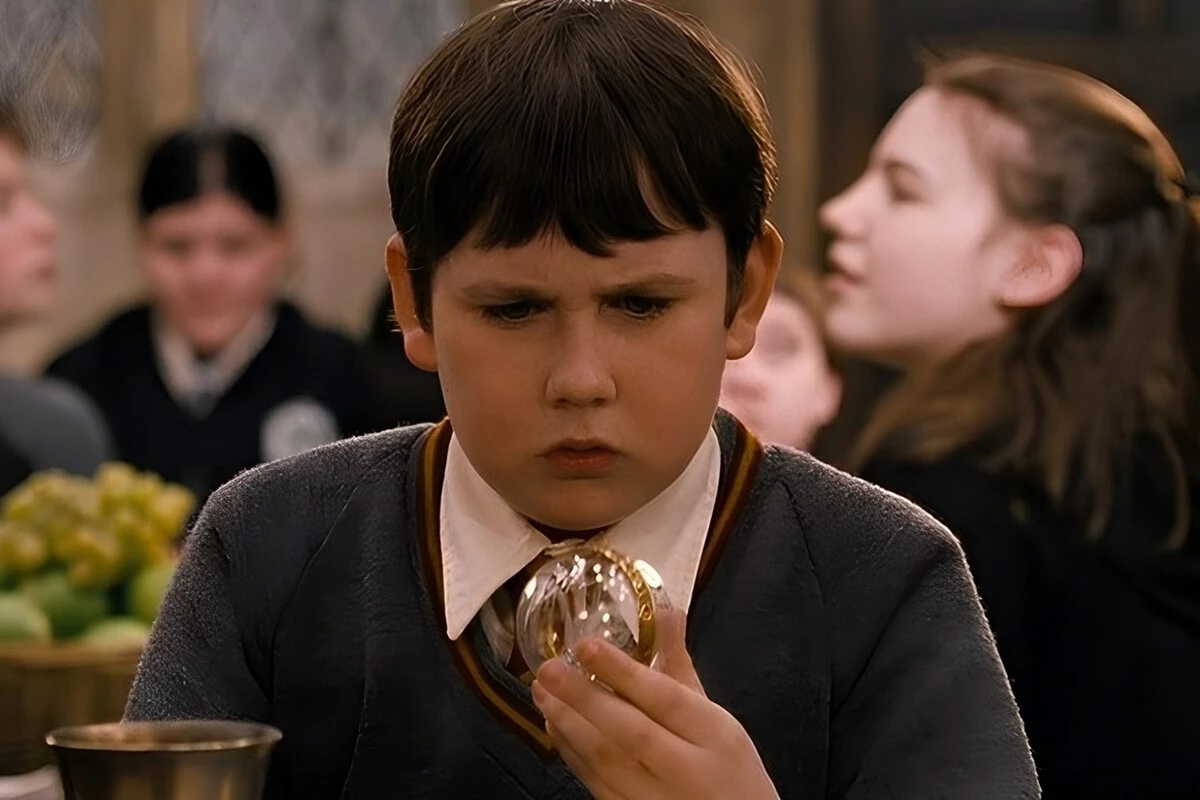El alumno recibe el paquete por parte de su abuela en mitad del Gran Comedor del colegio y, rápidamente, la esfera muestra su característico humo rojo. El muchacho no tiene ni idea de qué es lo que debe recordar, la audiencia tampoco y en ningún momento de la producción se nos aclara cuál es el olvido. Sin embargo, si te fijas en el resto de jóvenes que se encuentran realizando tareas en la mesa, obtendrás una pista muy evidente.