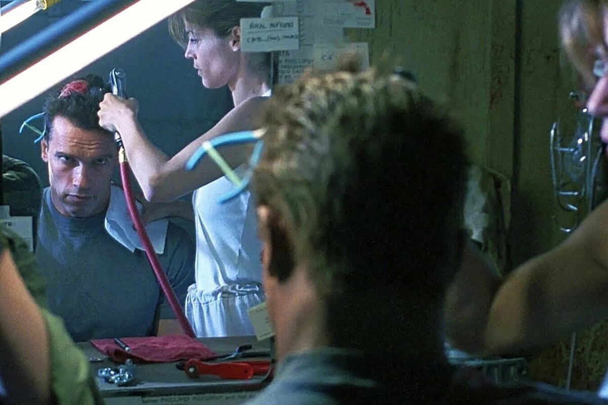 El cámara no aparece reflejado en el espejo, ya que esto es debido a que la cabeza del T-800 no es la de Schwarzenegger, sino que es falsa. Linda Hamilton y Edward Furlong simulaban operarla, mientras que el espejo no existe como tal, ya que lo que vemos es un hueco. Al otro lado se encuentra realmente el actor austríaco, mientras que Leslie, la hermana gemela de Linda Hamilton, imita sus movimientos al otro lado y una doble de cuerpo replicó los movimientos de Furlong.