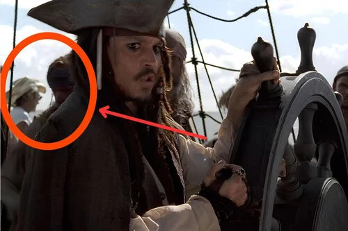 Efectivamente, una persona con gafas de sol, sombrero de cowboy y camiseta sin mangas también se encuentra en la cubierta de la Perla Negra, pero no parece muy atento a las indicaciones de Jack Sparrow. Apenas se le ve en el plano, de fondo, y podemos intuir que se trata de un miembro del equipo de rodaje que no estuvo muy pendiente de lo que estaban haciendo sus compañeros de equipo.