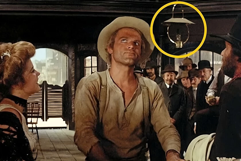 Con un rodaje a caballo entre España, Arizona, Luisiana y Nuevo México, Mi nombre es Ninguno nos llega a situar en una escena en un saloon, la cual muestra un duelo de bofetadas hilarante. Sin embargo, si pausamos la acción a los 52 minutos y 36 segundos, podremos fijarnos en una pared de ladrillo blanca a la izquierda y unas columnas de madera que componen el escenario.