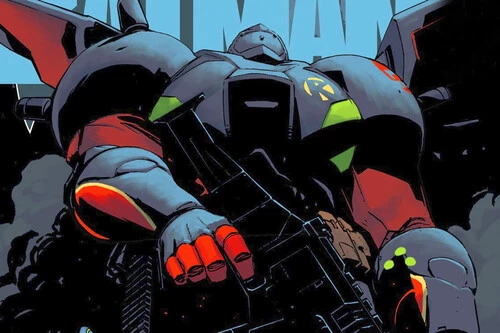 La portada de Absolute Batman #20 de Nick Dragotta muestra a Batman blandiendo su hacha frente a un grupo desconocido compuesto por dos Jaegers a lo Pacific Rim y tres integrantes en moto que recuerdan a los Power Rangers. No hace falta ser el fan más acérrimo para al menos intuir quiénes componen este variopinto grupo que se presenta ante el Caballero Oscuro. Los colores son la clave.