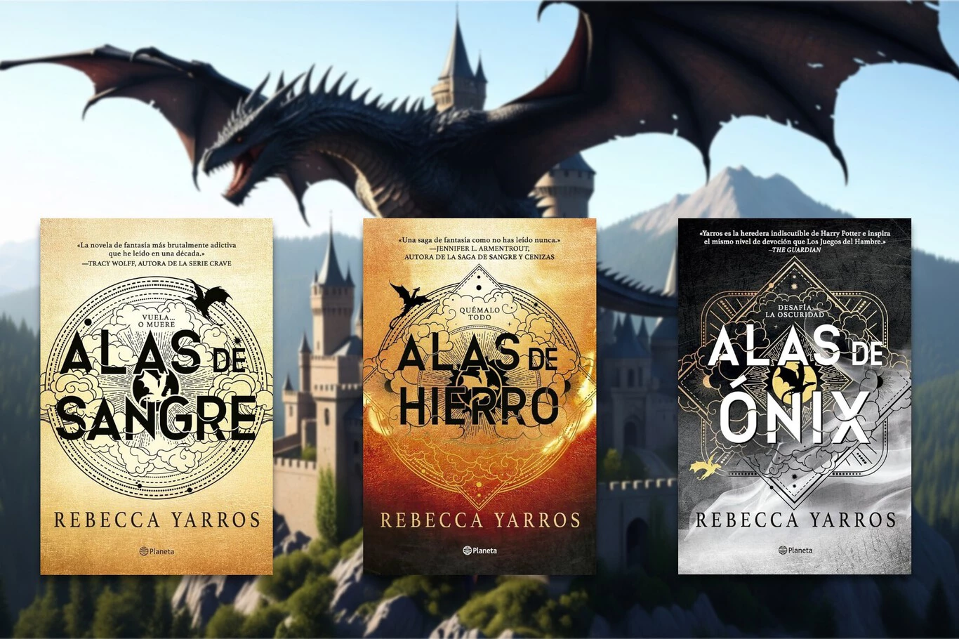 La saga Empíreo está planteada como una pentalogía de la cual por ahora sólo se han publicado las tres primeras novelas: Alas de Sangre, Alas de Hierro y Alas de Ónix, la última de ellas lanzada en enero de 2025. Me las he leído seguidas, del tirón, unas 2.500 páginas en total (cuando digo "lecturas ligeras" en el titular me refiero al contenido y a que se leen rápido, porque en cuanto a páginas van sobradas), lo cual ya da una pista de hasta dónde puede llegar a enganchar su historia a pesar de los muchos problemas que tiene. Porque los tiene y no son precisamente inofensivos. Pero ya llegaremos a eso.
