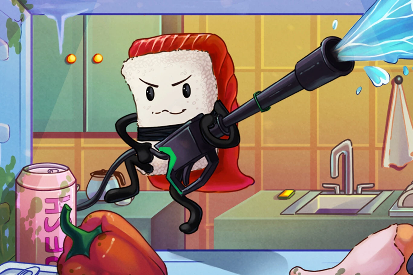 En este caso nos ponemos en la piel de un adorable sushi de salmón o nigiri cuya misión es combatir el moho allá donde aparezca, que generalmente se encuentra en la cocina. Todo con música de fondo, algunas mecánicas simples inspiradas en los simuladores de limpieza mencionados en el anterior párrafo y un tamaño reducido que hace que el mundo cotidiano se vea gigantesco, como en Toy Story.